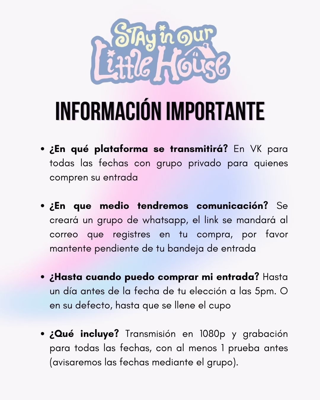 - Dados los cambios en Beyond Live a partir del 5to Fanmeeting de Stray Kids, la plataforma ha sido mucho más estricta con las retransmisiones, hemos solucionado la pantalla negra por lo que no tenemos problema por llevar esta venta a cabo, pero podemos recibir alguna notificación, la baja de nuestra cuenta o incluso una demanda por temas de cophyright, nos estamos arriesgando a retransmitir con el objetivo de que más personas puedan disfrutar de este y otros eventos a un costo accesible
